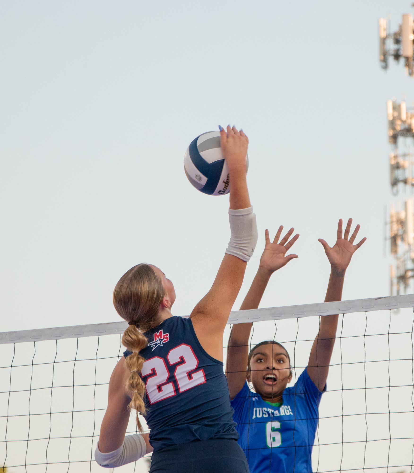 Number 22, Scotlyn Erwin swats the ball down over number 6 Andi Blomenkamp during a set against the Millard North Mustangs. Photo by Regina Ho
